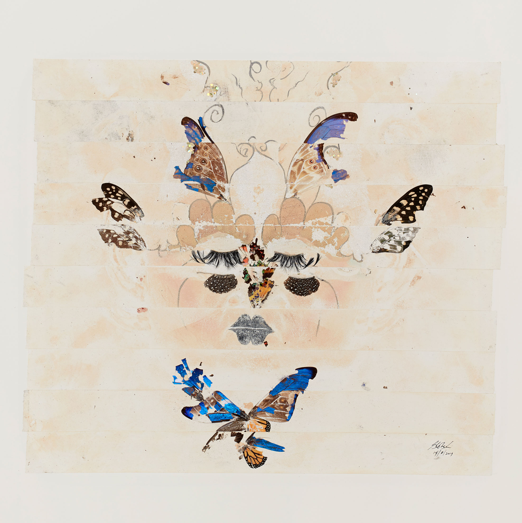 Archival tape, makeup, glitter, synthetic eyelashes, feathers, moth wings, butterfly wings